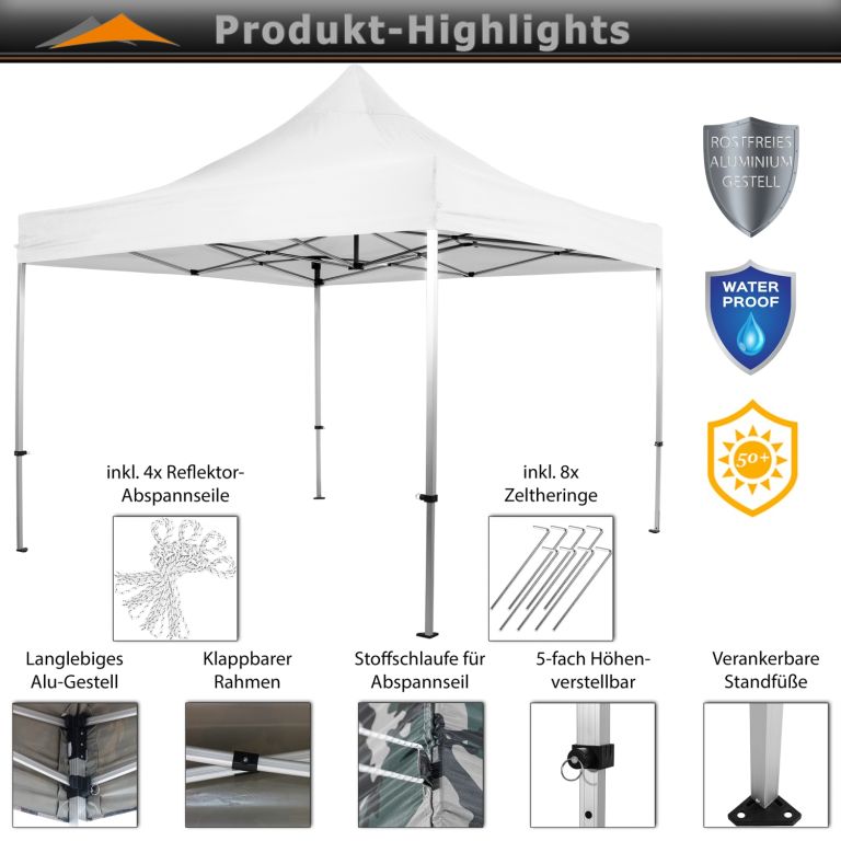 Namiot ten gwarantuje bardzo wysoką jakość użytego materiału. Jest odporny na wodę i rdzę. Zapewnia ochronę przed słońcem. Specjalnie impregnowany materiał cierny blokuje do 98% światła słonecznego, a tym samym zapewnia ochronę przed promieniowaniem UV. Wyjątkowo mocne nogi teleskopowe i solidna rama nożyc gwarantują najwyższą stabilność i funkcjonalność. Inne zalety to powiększone pręty stojące i wyjątkowo stabilne połączenia przegubowe. Namiot można ustawić w pięciu różnych pozycjach wysokości od 310 do 340 cm. Zintegrowana centralna kolumna napinająca zapewnia podparcie i stabilność dachu altany.