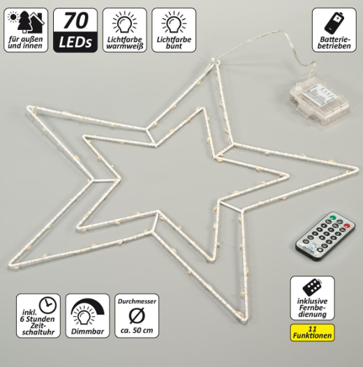 Dekoracja w kształcie gwiazdy świeci przyjemnym światłem i gwarantuje niskie zużycie energii. Możesz użyć timera, aby zdecydować, kiedy chcesz włączyć oświetlenie. Dowolnie wybierana funkcja timera lub ciągłego oświetlenia. Diody LED są popularnym zamiennikiem konwencjonalnych żarówek. W porównaniu z tradycyjnymi żarówkami, diody LED nie emitują ciepła, są odporne na wstrząsy i dzięki nim można zaoszczędzić do 90% energii, którą w innym przypadku zużyliby Państwo na zwykłe żarówki. Średnia żywotność diody LED to 2000 godzin świecenia (normalna żarówka ok. 1000 godzin w zależności od jasności).