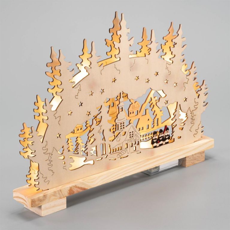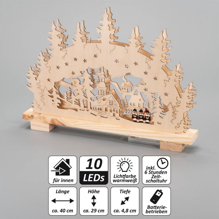 Ten dekoracyjny łuk świetlny jest piękny ze wszystkich stron, dzięki czemu można go umieścić na środku pokoju i cieszyć się widokiem z dowolnego miejsca. Nie jesteś też ograniczony żadnym kablem, ponieważ dekoracja jest zasilana bateryjnie. Technologia LED zapewnia niskie zużycie energii. Korzystając z timera, możesz sam zdecydować, kiedy chcesz włączyć oświetlenie. Komora baterii jest przymocowana od spodu dekoracji.