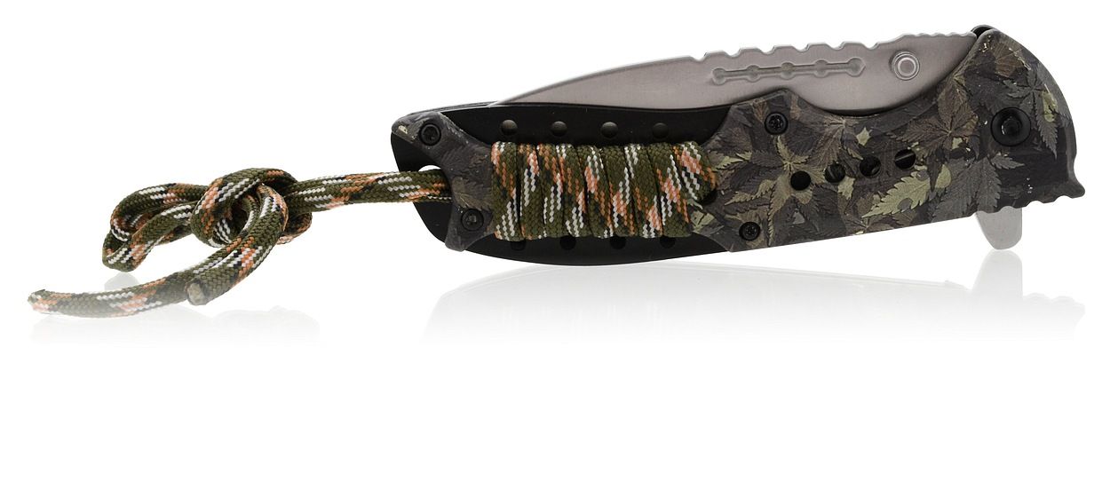 Nóż o niskiej wadze z nadrukiem liści konopi i kamuflażem leśnym. Cana Knife to przydatny asystent do biwakowania, łowienia ryb i innych zastosowań na