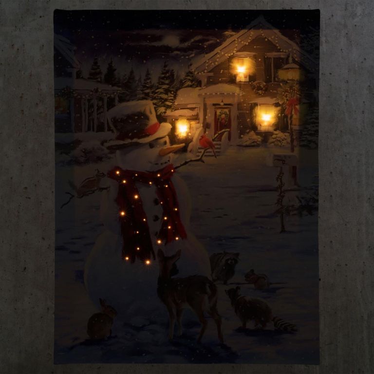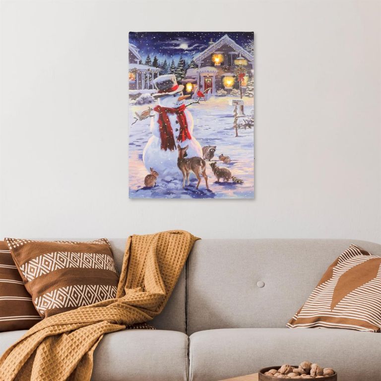 Obraz z motywem bałwanka, w tym dioda LED, wyczaruje przyjemny nastrój i przytulną atmosferę w przestrzeni mieszkalnej w dowolnym miejscu.