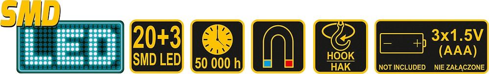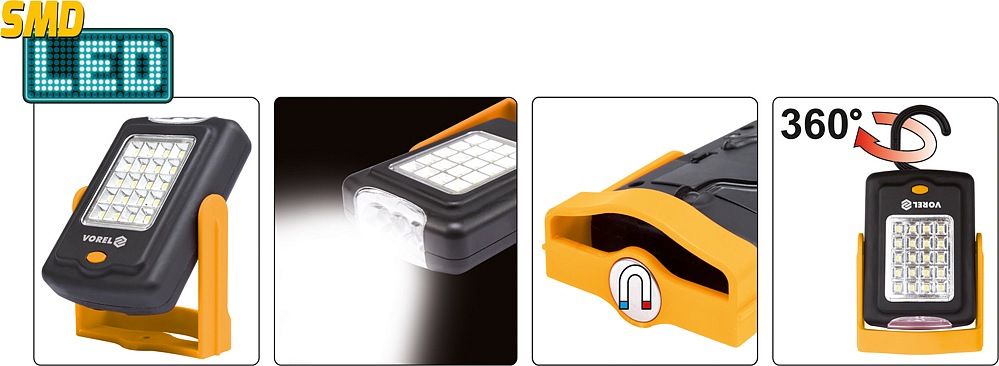 Przenośna latarka z diodami SMD o dużej mocy i małej mocy. Zapewnia dwa tryby świecenia - stałe białe światło i stały biały reflektor. Latarkę można łatwo zamontować za pomocą wbudowanego magnesu w uchylnym uchwycie lub zawiesić na wbudowanym haku.