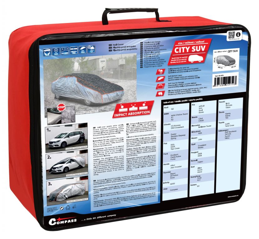 Plandeka przeciwgradowa do przykrycia całego pojazdu o wysokiej odporności na warunki atmosferyczne. Górna część jest wzmocniona wzmocnionym materiałem, który może absorbować uderzenia gradu, a tym samym zapobiegać uszkodzeniom pojazdu. Łatwy montaż - wystarczy umieścić plandekę na samochodzie, przymocować gumową wszytą część u dołu do odpowiednich zagięć nadwozia/zderzaka i zabezpieczyć przód i tył plandeki za pomocą wszytych pasków z klamrami.