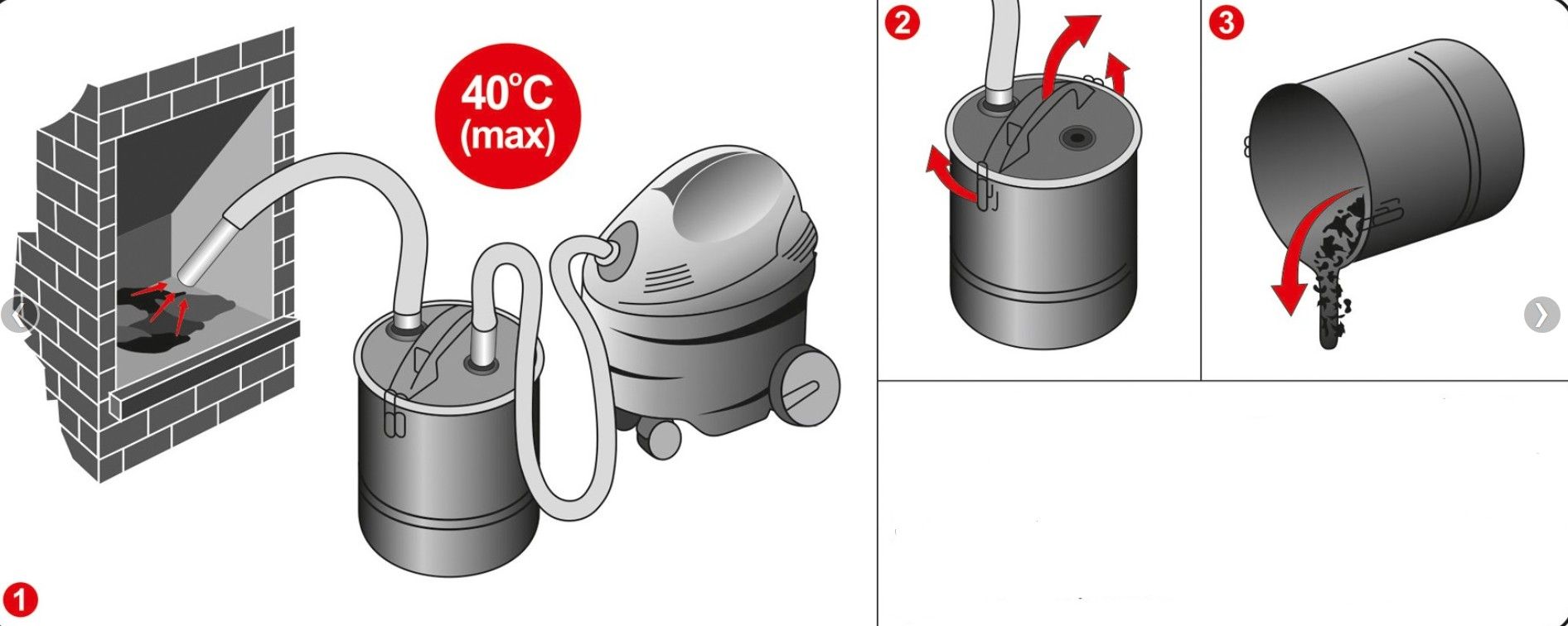 Uwaga: Nie używać do cieczy. Temperatura popiołu nie może przekraczać + 40 ° C. Przed każdym użyciem sprawdź zbiornik i wyczyść filtr strumieniem sprężonego powietrza. W przypadku nadmiernego zabrudzenia należy wymienić filtr na nowy.