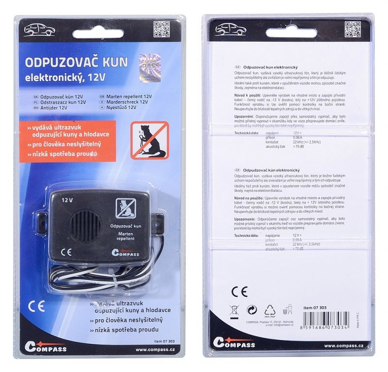 Sposób użycia: przymocuj produkt w odpowiednim miejscu i podłącz przewód zasilający - przewód czarny do -12 V (masa), biały do +12V zabezpieczony bezpiecznikiem. Funkcjonalność produktu można sprawdzić za pomocą bocznej lampki. Nie montuj w pobliżu źródeł ciepła lub w wilgotnych miejscach. Uwaga: Zalecamy podłączenie go przez osobny wyłącznik, aby można było wyłączyć urządzenie podczas przewożenia zwierzaka w samochodzie, dla którego wysoki dźwięk może być również nieprzyjemny.