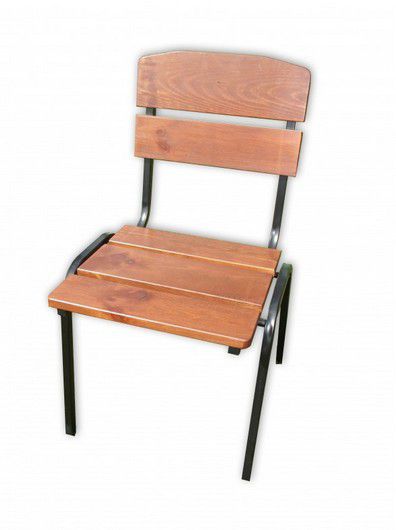 Ogrodowe krzesło do układania w stos. Wykonane z drewna sosnowego z metalową podstawą. Kolor drewna jest brązowy.