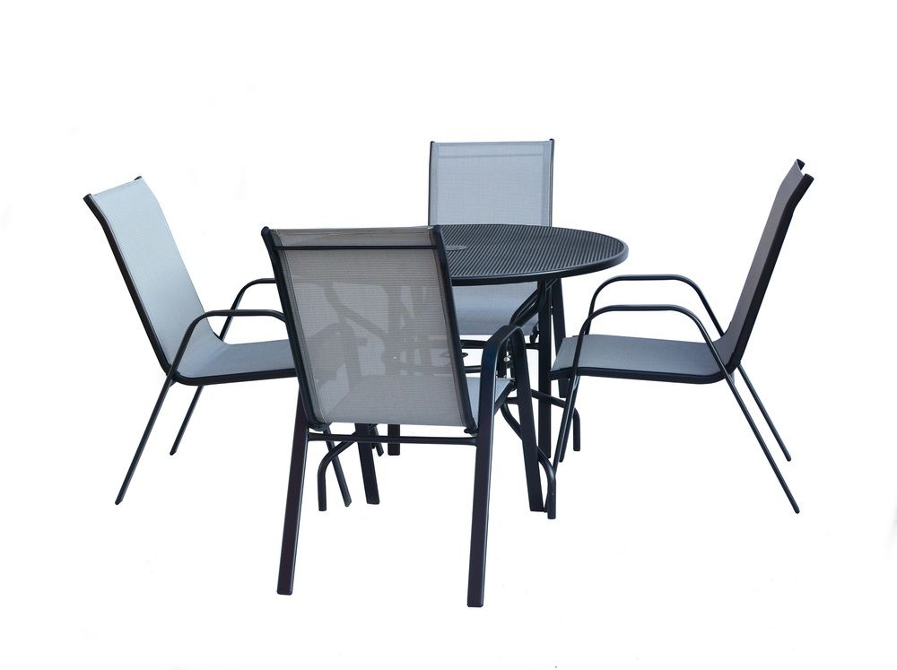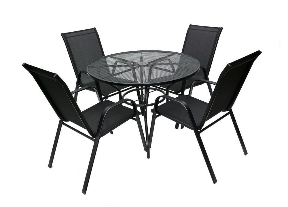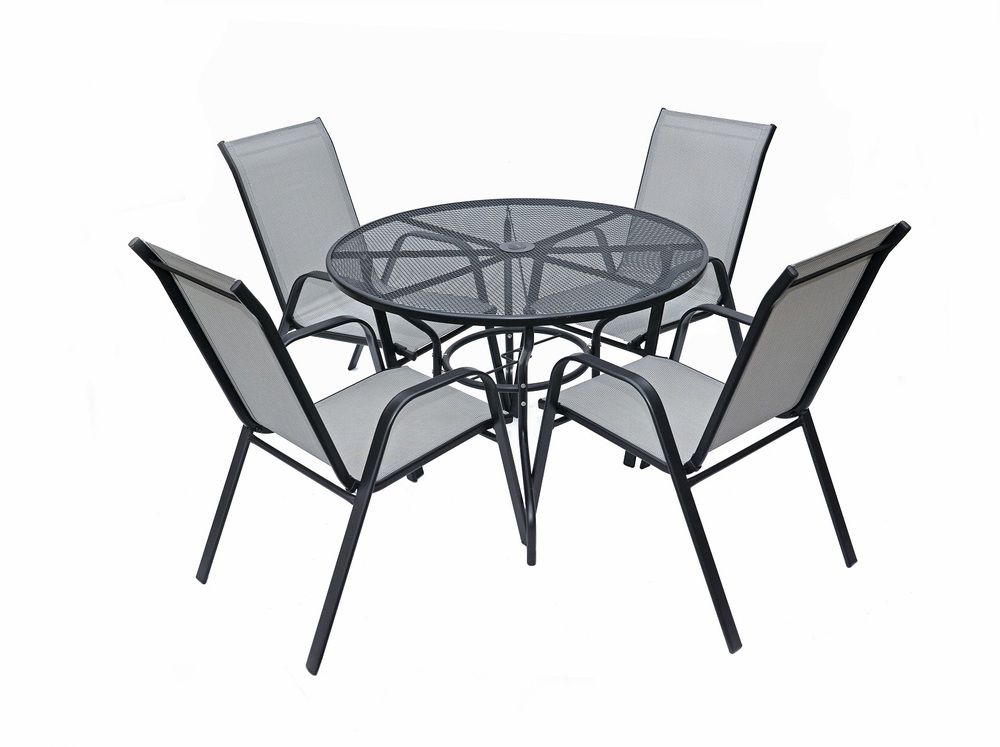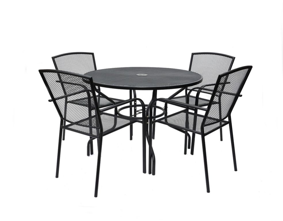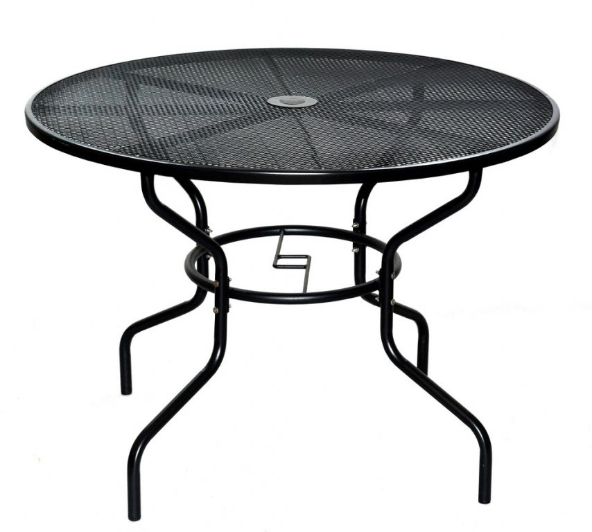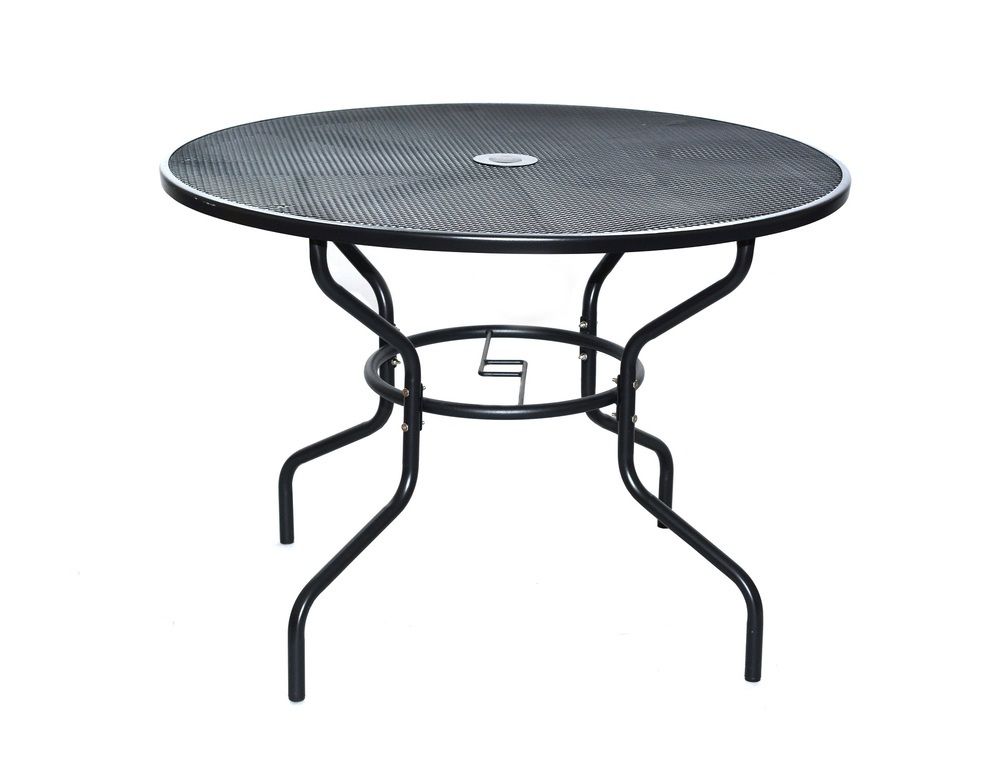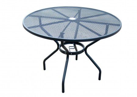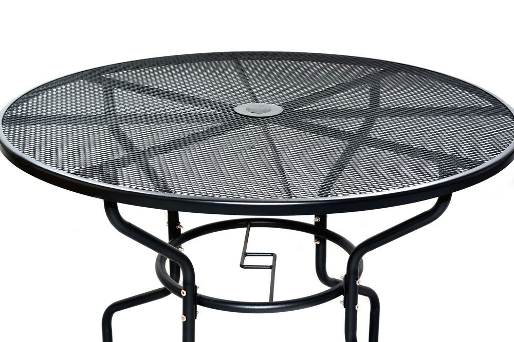 Okrągły, metalowy,stół ogrodowy z drucianym blatem. Stół jest dobrze zmywalny. W środku blatu miejsce do umieszczenie parasola.