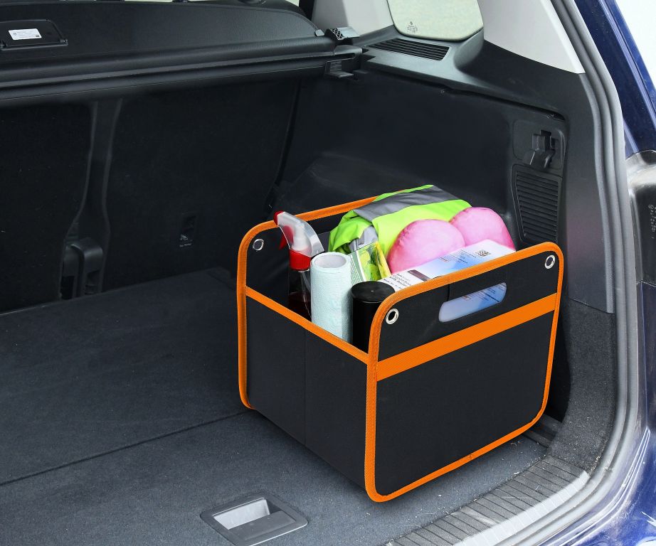 Składany organizer do bagażnika samochodu. Organizer jest wzmocniony, dzięki czemu można w nim umieścić nawet cięższe przedmioty. Przednia strona wyposażona jest w wszytą gumę, która służy do zabezpieczenia organizera w stanie złożonym lub może pomieścić różne drobne przedmioty, np. artykuły papiernicze itp. Po napełnieniu organizera możliwa jest wygodna obsługa, szczególnie dzięki ergonomicznie wszytym uchwytom.