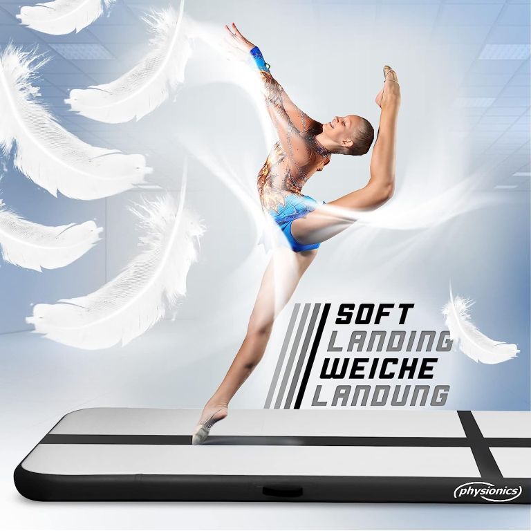 Nadmuchiwana mata gimnastyczna to wszechstronne narzędzie treningowe odpowiednie do szerokiej gamy zajęć sportowych, takich jak gimnastyka, cheerleading, parkour, sztuki walki, sporty szkolne i inne. Może być również używana w basenie. Mata wykonana jest z dwuściennego materiału, którego główną cechą jest zachowanie kształtu i stabilności konstrukcji pod wpływem zewnętrznego nacisku i uderzenia.