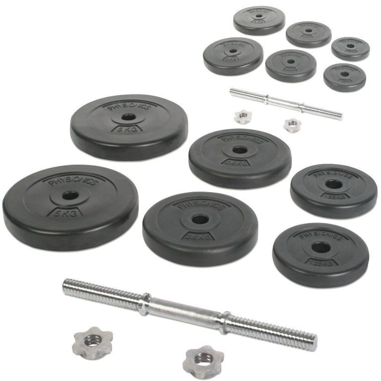 W zestawie znajdują się obciążenia o wadze 2 kg, 2,5 kg i 5 kg. Ten zestaw jest idealny do zbilansowanego treningu w domu.