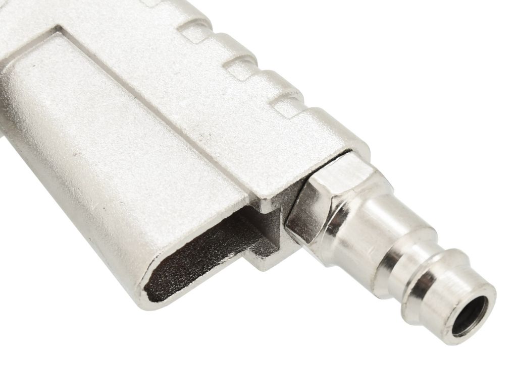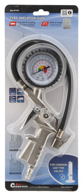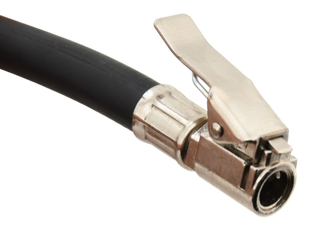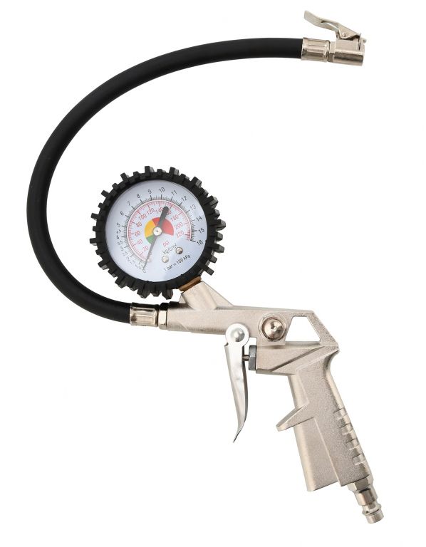 Metalowy pistolet pneumatyczny wyposażony jest w wąż wykonany z wytrzymałej gumy, manometr oraz adapter, który jest przeznaczony do stosowania na zwykłych zaworach samochodowych.