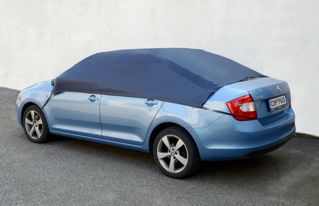 Oddychająca plandeka na dachu samochodu. Optymalnie zapobiega tworzeniu się oblodzenia na szybie, nadaje się również do zabrudzenia samochodu.