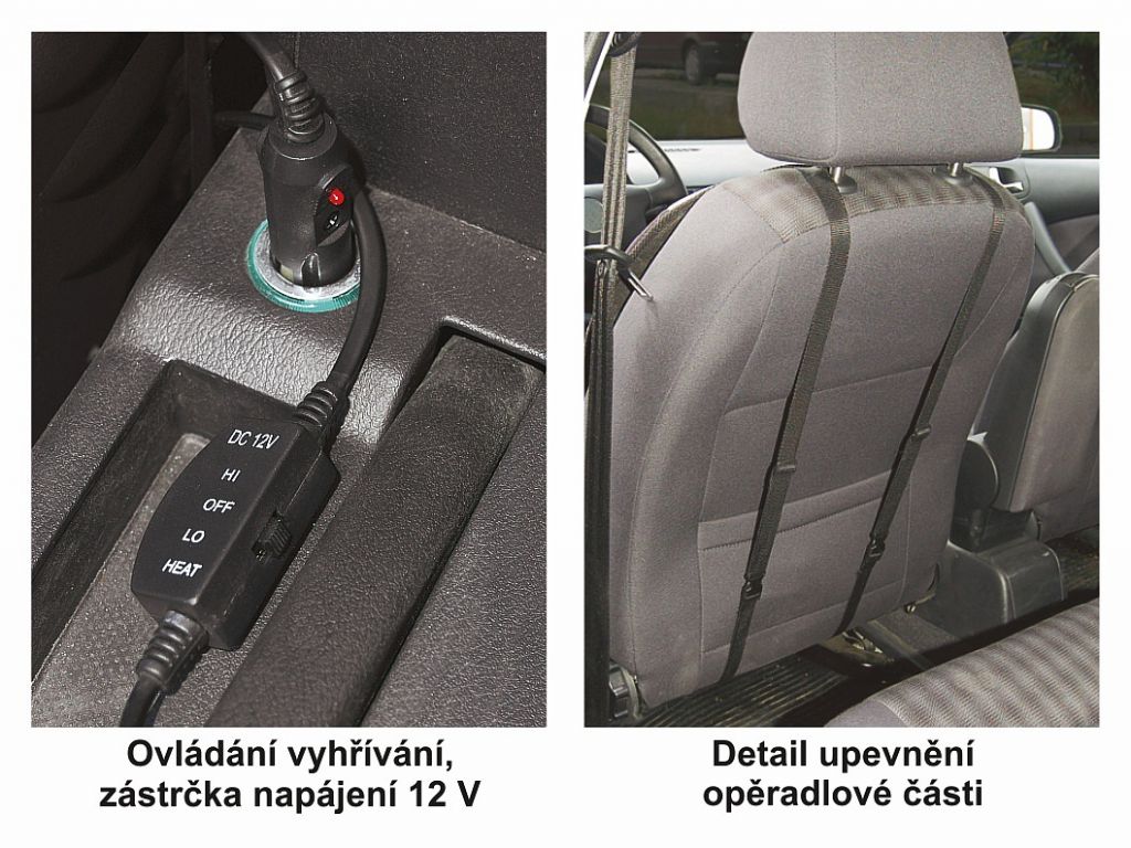 Podłączenie do standardowego gniazda zapalniczki samochodowej ze złączem 12V. Zawiera uniwersalny system mocowania, można go przymocować do najczęściej używanych fotelików samochodowych. Pokrowiec może być również stosowany na siedzeniach, które mają wbudowaną boczną poduszkę powietrzną bezpośrednio w oparciu przednich siedzeń. Osłona wyposażona jest we wbudowany termostat i sterowanie, za pomocą którego można wybrać niski (LO) lub wysoki (HI) tryb grzania osłony.