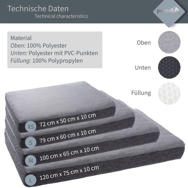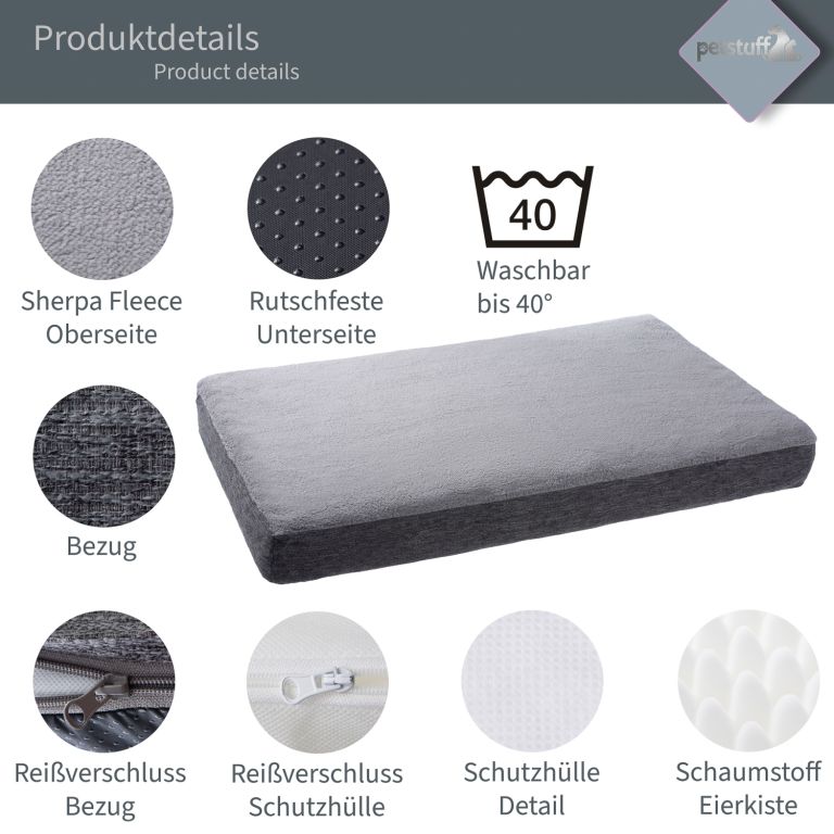 Poduszka dla zwierząt to przyjemne miejsce do spania dla Twojego psa, kota lub innych zwierząt. Nasz produkt nadaje się również jako dodatek do szopy, klatki lub skrzyni transportowej. Ciężar jest równomiernie rozłożony na poduszce i amortyzuje wstrząsy, co jest nie tylko wygodne, ale także chroni stawy zwierzęcia. Zamek błyskawiczny umożliwia łatwe zdjęcie pokrowca i wypranie go ręcznie lub w niskich temperaturach. Dodatkowo hydrofobowa folia wewnętrzna chroni piankę przed zabrudzeniem. Spód poduszki wykonany jest z solidnego materiału, dzięki dodatkowym antypoślizgowym wypustkom zmniejsza się poślizg.