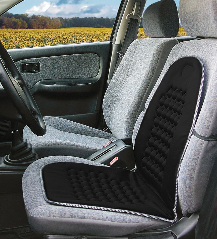 Pokrowiec masujący na fotelik samochodowy z wbudowanymi magnesami i uniwersalnym systemem mocowania.