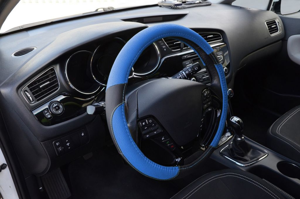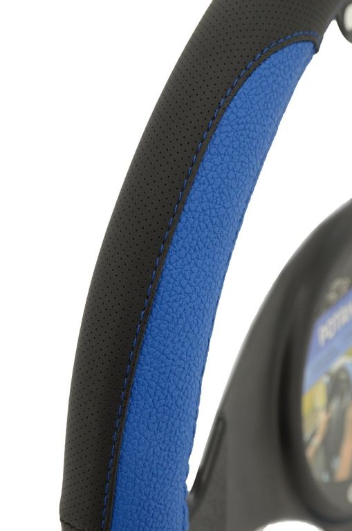 Stylowy pokrowiec na kierownicę o niepowtarzalnym designie, w pastelowym niebieskim kolorze z czarnym tłem i pastelowymi niebieskimi przeszyciami. Pokrowiec jest przyjemny w dotyku, ergonomicznie ukształtowany z perforacjami ułatwiającymi chwyt. Pokrowiec chroni kierownicę przed zużyciem i poprawia kierowanie.