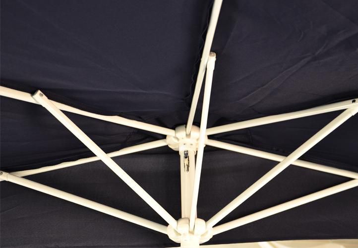 Aby nic Cię nie rozpraszało, materiał z trwałego poliestru 160 g/m² opiera się na pięciu stalowych żebrach, które wytrzymują wiatr i lekki deszcz. W zestawie znajduje się solidna półokrągła podstawa oraz wodoodporny pokrowiec, dzięki czemu po sezonie szybko schowasz parasol, nie tracąc koloru ani kształtu.