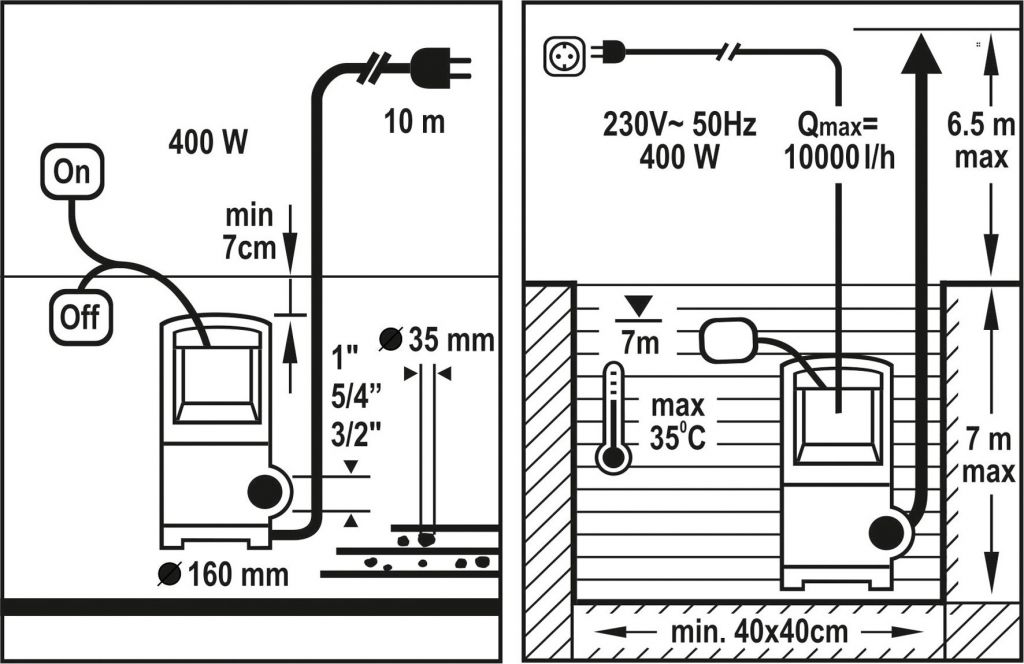 Korpus pompy jest wykonany z bardzo wytrzymałego tworzywa sztucznego i jest wyposażony w wyłącznik pływakowy, który zapobiega pracy pompy na „sucho". Do podłączenia do sieci pompa jest wyposażona w kabel o długości 10 m.