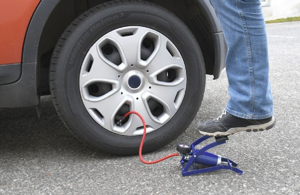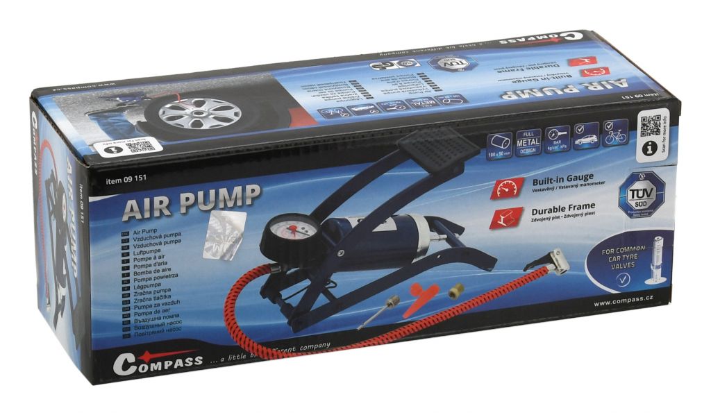 Pompka nożna - inflator z dwoma tłokami i manometrem do pompowania opon samochodowych. W opakowaniu znajdują się adaptery do różnych zastosowań.