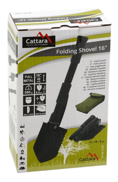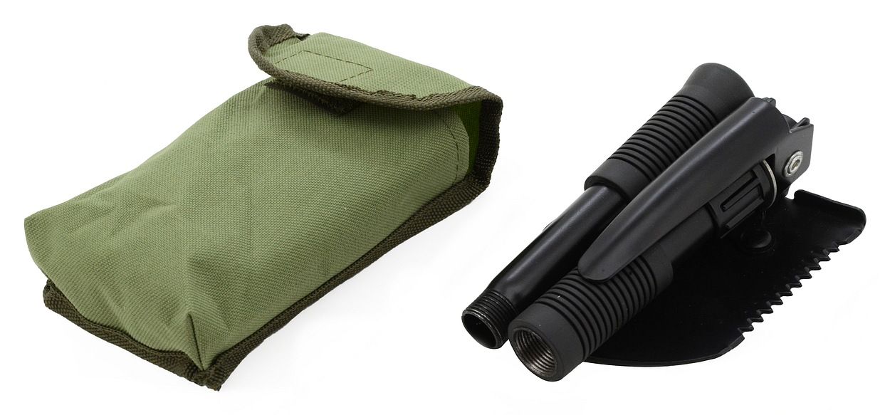 Jest to łopata, która po złożeniu ma wymiary 9,5 x 16 cm i jest sprzedawana z wytrzymałym, zielonym etui tekstylnym, które można przymocować do paska.