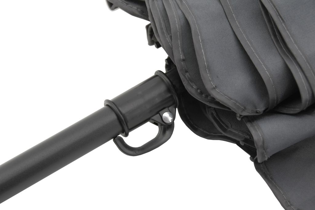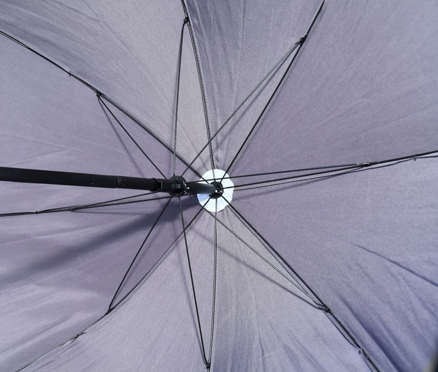 Długość „promienia" parasola wynosi 180 cm, a całkowita wysokość 200 cm. Dwuczęściowa konstrukcja jest składana i łatwa do złożenia. Wszystko, co musisz zrobić, to zsunąć razem dwa pręty podtrzymujące i zabezpieczyć dźwignią. Następnie wystarczy rozłożyć parasol. Konstrukcja parasola ma spiczasty koniec, dzięki czemu nadaje się do wbijania w ziemię.