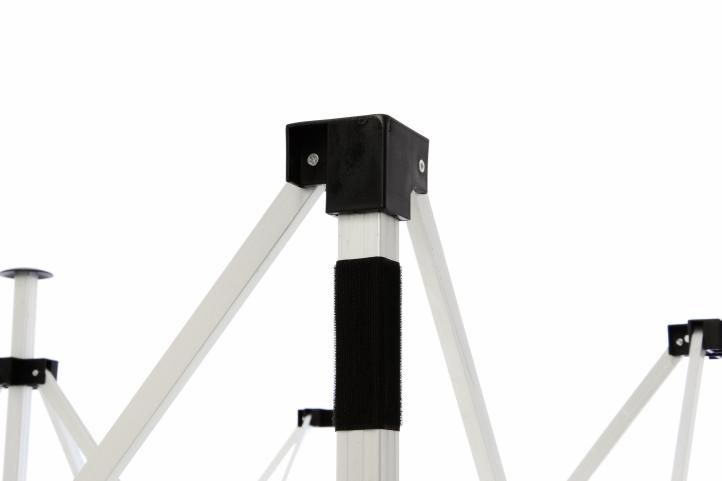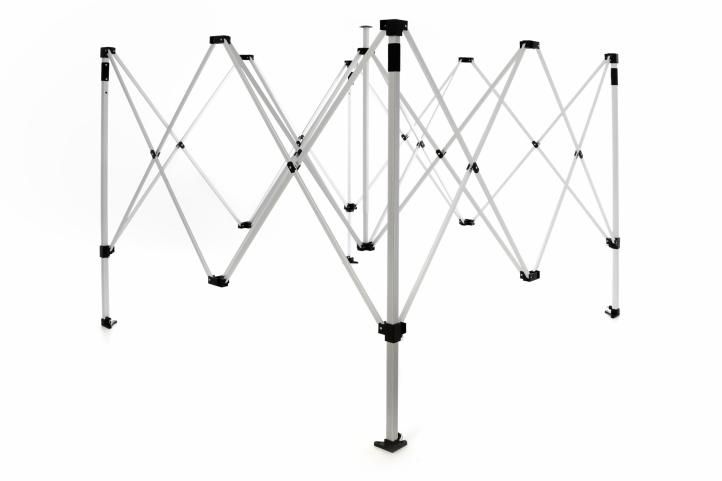 Konstrukcja - składany stelaż do pawilonów Profi 3 x 3 m. Teleskopowe nogi wykończone stopkami które można przytwierdzić do podłoża. Nogi pozwoli regulację wysokości.