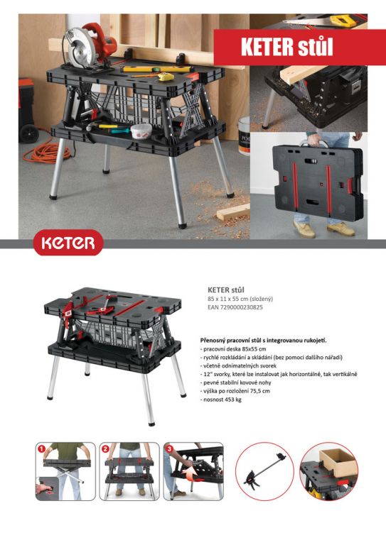 Przenośny stół roboczy ze zintegrowanym uchwytem i blatem 85 x 55 cm. Szybkie rozkładanie i składanie (bez pomocy dodatkowych narzędzi), w tym zdejmowane zaciski, które można montować zarówno w poziomie, jak i w pionie. Solidne stabilne metalowe nogi o wysokości 75,5 cm i nośności 453 kg.