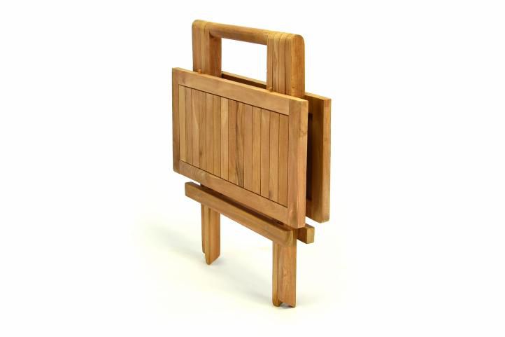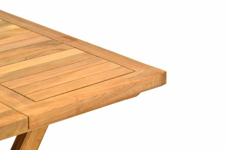Elegancki składany stół wysokiej jakości. Stół można wykorzystywać dzięki dwustronnemu systemowi składania. Jest to praktyczny dodatek na balkonie, tarasie, w ogrodzie lub w oranżerii. Drewno tekowe jest solidnym i odpornym na warunki atmosferyczne drewnem tropikalnym, które jest bardzo odpowiednie do jego właściwości zewnętrznych.