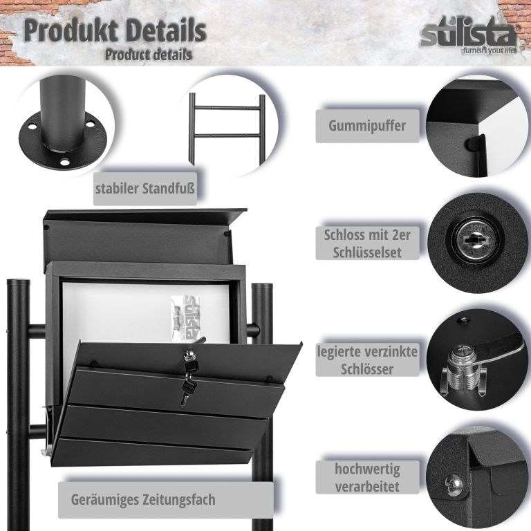 Naścienna skrzynka pocztowa Stilista o nowoczesnym wyglądzie oferuje mnóstwo miejsca na listy i pocztówki. Pudło ma duży otwór na litery i dlatego nadaje się również do dużych listów i grubszych kopert. Są w ten sposób chronione przed warunkami atmosferycznymi. Dzięki dołączonemu materiałowi montażowemu skrzynkę zmontujesz szybko i łatwo. Dzięki dwóm nogom możesz postawić skrzynkę osobno i nie potrzebujesz ściany do montażu.