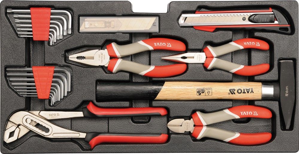 Odpowiednie akcesoria i pomocnik do różnych maszyn. Jakość z Yato. Zawiera zestaw gola z kluczami 6 - 21 mm, a także młotek i żyletkowy nóż. Metalowa obudowa jest odporna na trudne warunki