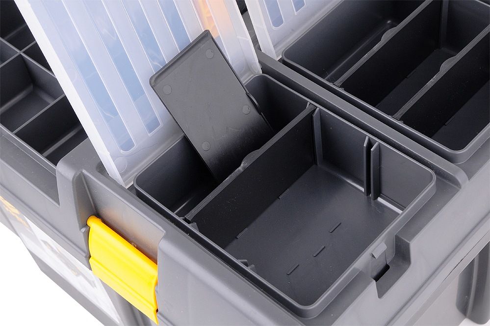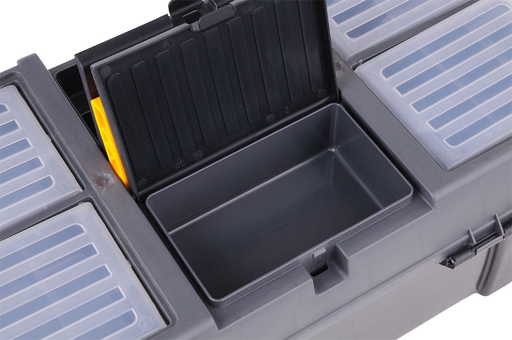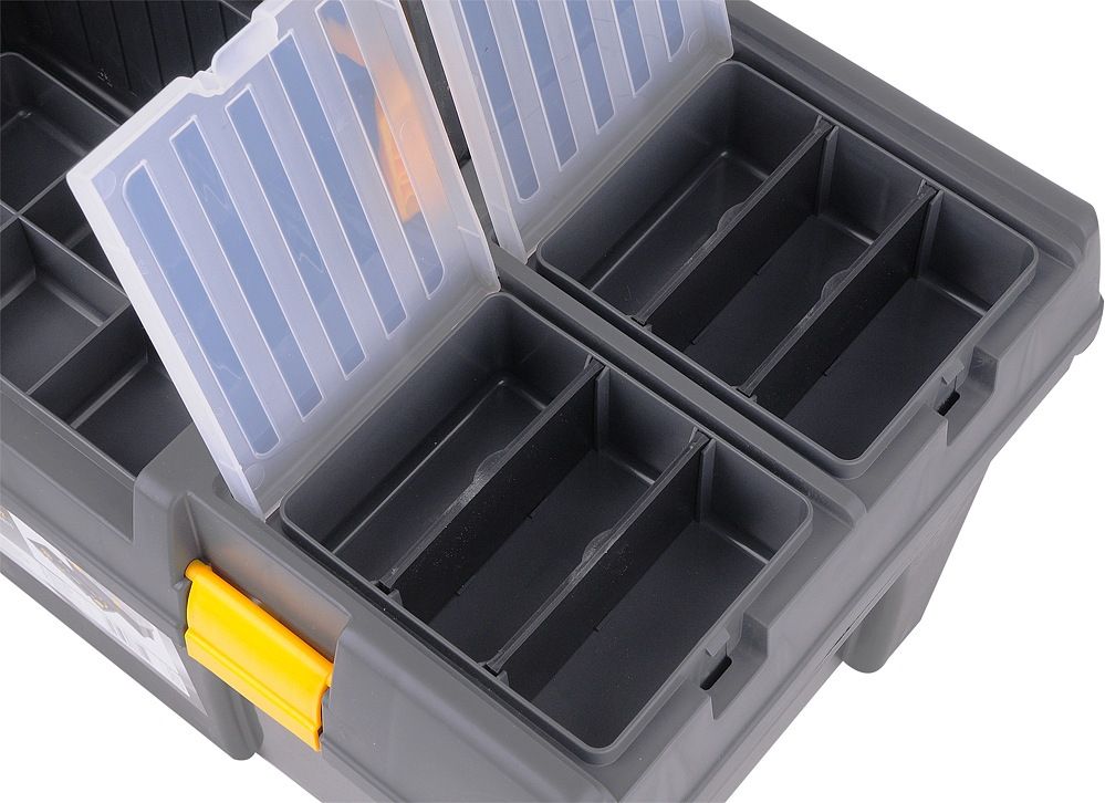 Plastikowa skrzynka z dwoma wyjmowanymi organizerami na pokrywie i wewnętrzną wyjmowaną wkładką na małe przedmioty.