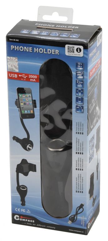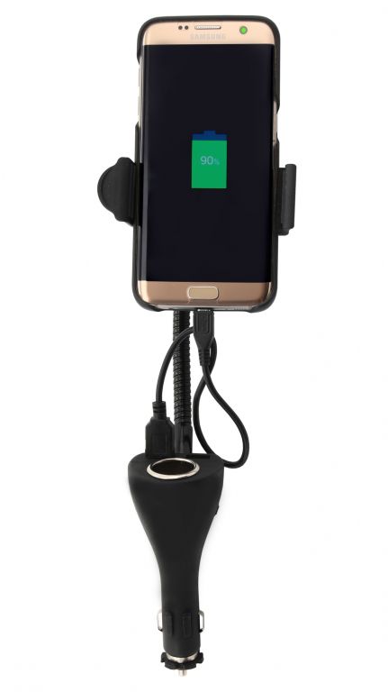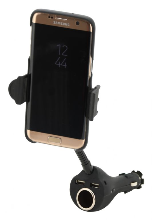 Samochodowy uchwyt na telefon. Uchwyt można w pełni dostosować do potrzeb, dzięki przegubowi zapewniającemu dowolny obrót, a przede wszystkim za pomocą elastycznego, w pełni elastycznego korpusu. Uchwyt nadaje się do trzymania telefonu. Mimo że uchwyt jest umieszczony w gnieździe zapalniczki 12/24V, gniazdo zostanie zachowane dzięki pomysłowej konstrukcji, a dodatkowo zostanie dodane złącze USB 2x 2 A.