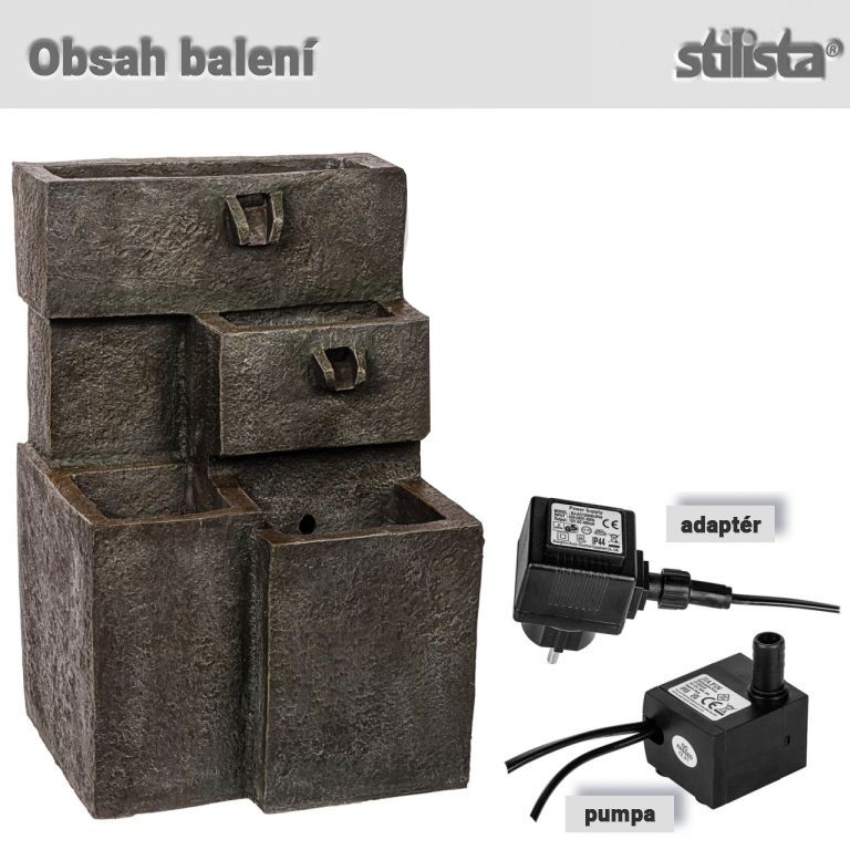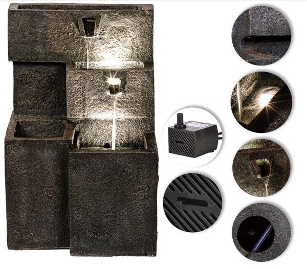 Dzięki płynnej pracy pompy wodnej woda płynie w obwodzie, dzięki czemu nie jest wymagane podłączenie wody. Fontanna wykonana jest z wysokiej jakości żywicy odpornej na warunki atmosferyczne i promieniowanie UV. Dostawa obejmuje pompę z płynną regulacją, dzięki czemu przepływ można dostosować do własnych potrzeb.