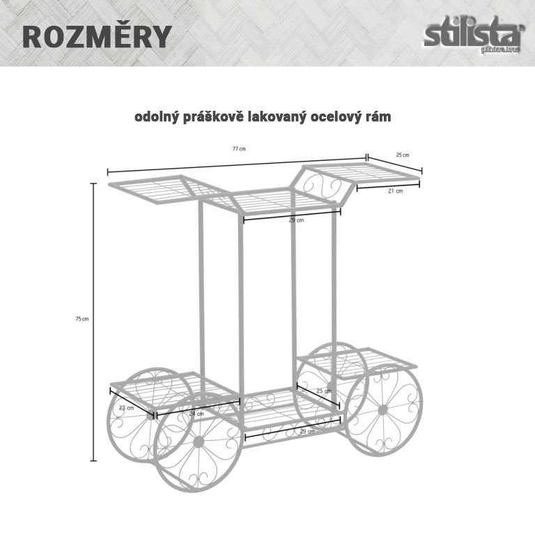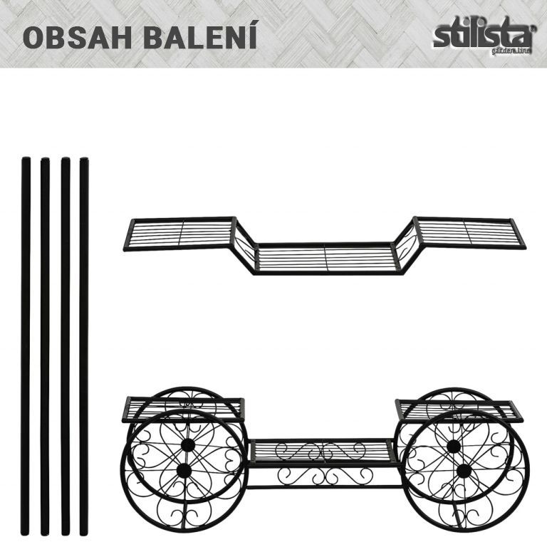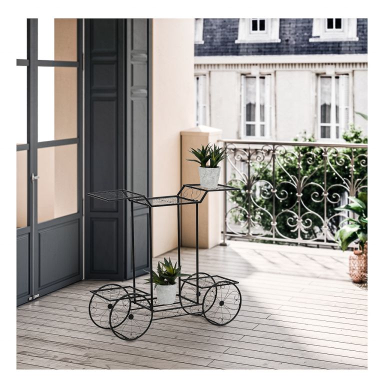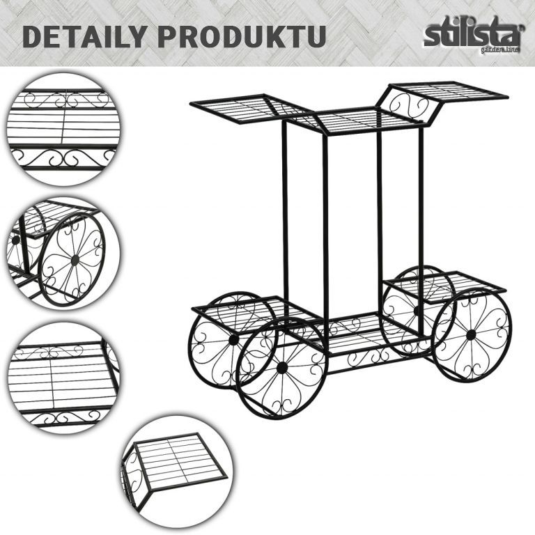 Nasz stojak w kształcie wózka na kwiaty wykonany jest z wytrzymałej stalowej ramy malowanej proszkowo. Klasyczne wzornictwo półek dopasuje się stylowo do każdego wnętrza i na zewnątrz. Regały na rośliny zapewniają dużo miejsca na rośliny o różnej wielkości, a także mogą służyć jako półki do przechowywania np. elementów dekoracyjnych.