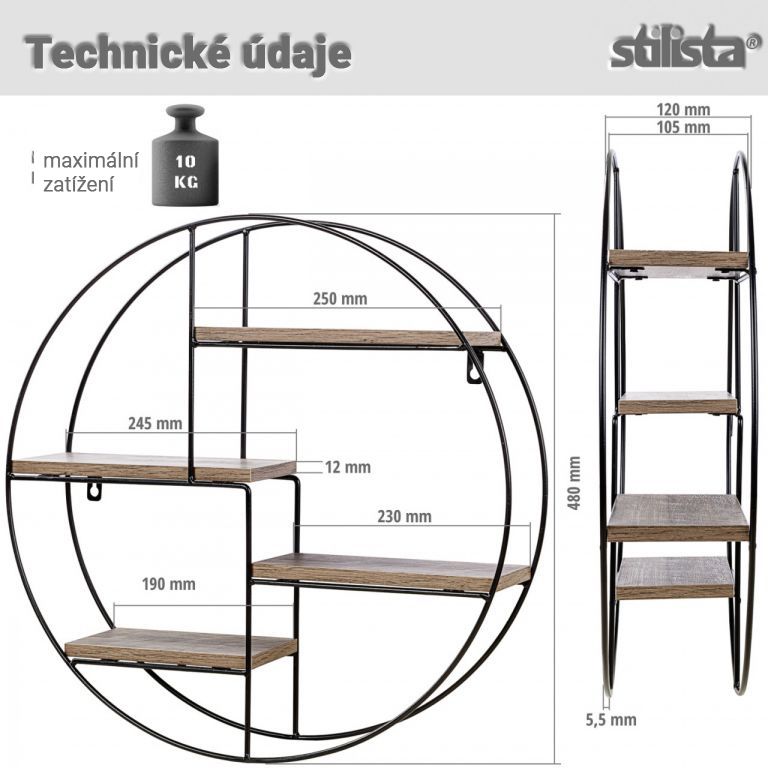 Półka wisząca "okrągła" wykonana jest z płyt drewnopochodnych przebadanych zgodnie z normą E1. Kompletna półka jest przebadana pod kątem substancji szkodliwych. Dzięki prostej ramie półka wisząca może stanowić doskonałe uzupełnienie innych kombinacji meblowych.