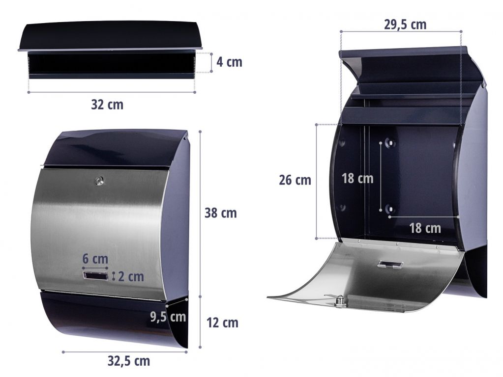 Skrzynka posiada duży otwór na listy, dzięki czemu nadaje się również na duże listy i grubsze koperty. Nasza skrzynka pocztowa wyposażona jest również w rolkę gazetową, która chroni gazety i broszury przed warunkami atmosferycznymi. Wyposażona jest również w metkę oraz gumowe paski, które chronią przed wilgocią i zabrudzeniami.