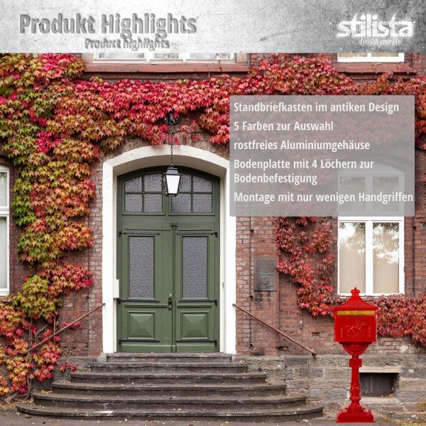 Wykonana z wysokiej jakości aluminium, odpornego na korozję i warunki atmosferyczne, ta skrzynka na listy oferuje idealne połączenie solidności i funkcjonalności. Kolumnowa skrzynka pocztowa zachwyca nie tylko nostalgicznym wyglądem, ale także długą żywotnością. Odporna na warunki atmosferyczne powłoka sprawia, że skrzynka pocztowa zapewnia optymalną ochronę nawet podczas deszczu, śniegu lub intensywnego nasłonecznienia. Elegancki design z artystycznymi zdobieniami dodaje ponadczasowej estetyki do strefy wejściowej. Skrzynka pocztowa w stylu vintage jest dostępna w wielu klasycznych kolorach. W ten sposób można idealnie dostosować skrzynkę pocztową do indywidualnych preferencji i istniejącej koncepcji projektowej. Skrzynka w klasycznym stylu zapewnia dużo miejsca na listy i gwarantuje ich bezpieczeństwo. Dzięki solidnej konstrukcji i wysokiej jakości materiałom można oczekiwać długotrwałego użytkowania bez kompromisów w zakresie jakości.