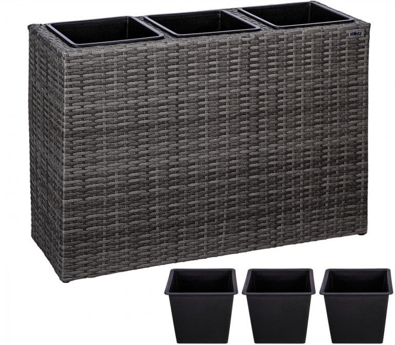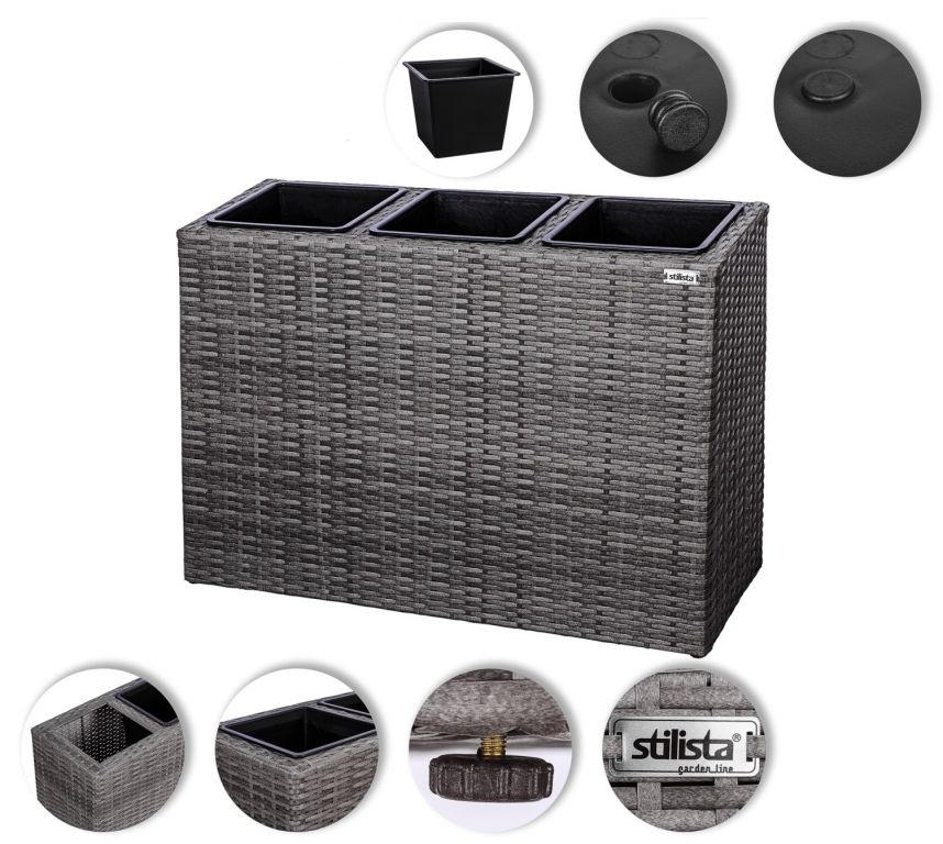 Piękny stojak na trzy doniczki to prawdziwa atrakcja dla Twojego domu. Stojak z donicami wewnętrznymi idealnie nadaje się do sadzenia w ogrodzie, na balkonie lub tarasie, może służyć również jako ścianka działowa. Materiał przekona Cię swoimi doskonałymi właściwościami: jest odporny na warunki atmosferyczne, promieniowanie UV, odpycha brud i jest łatwy w utrzymaniu czystości. Zdejmowane donice wewnętrzne wyposażone są w zamykany odpływ wody, co zapobiega przemoczeniu.