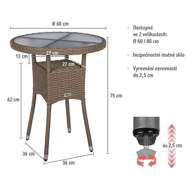 Stolik, w tym blat z matowego szkła, jest wykonany z ręcznie tkanego polirattanu i ma solidną stalową ramę malowaną proszkowo. Stół nadaje się do użytku wewnątrz i na zewnątrz, np. na tarasie, ogrodzie czy balkonie. Solidna stalowa konstrukcja jest owinięta wiklinową, odporną na warunki atmosferyczne i promieniowanie UV polirattanową, więc nie musisz się martwić o jej trwałość. Dzięki wstępnie zmontowanym śrubom poziomującym stół można bardzo łatwo wypoziomować i postawić na dowolnej powierzchni. Dolna półka stołu zapewnia wtedy dodatkową przestrzeń do przechowywania.