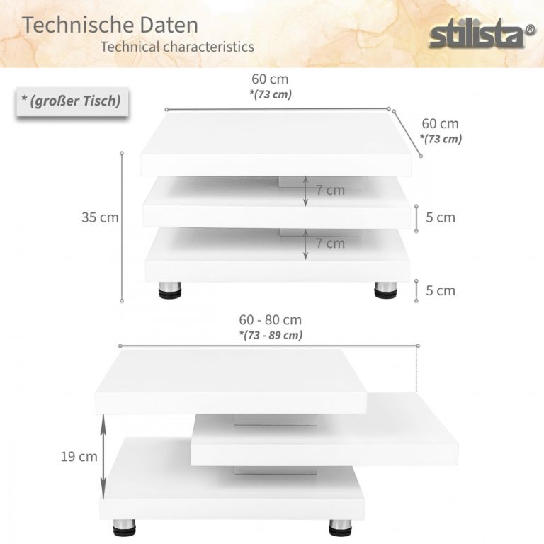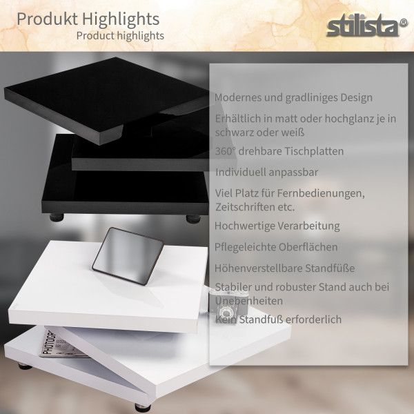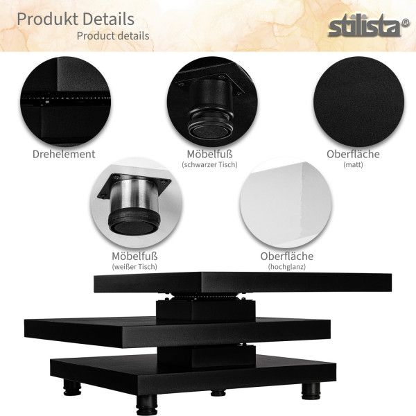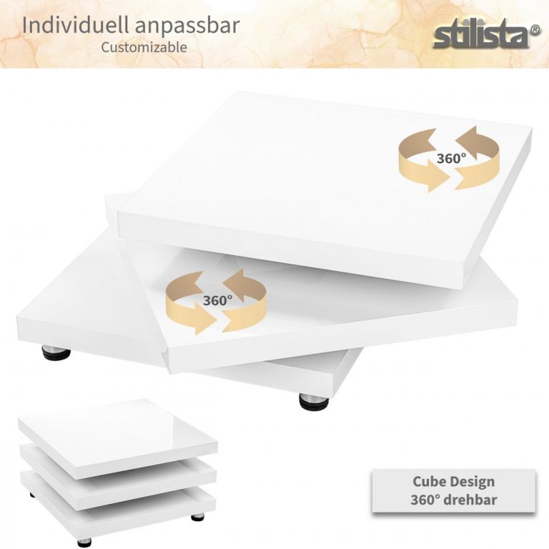 Ten stolik kawowy jest prawdziwą atrakcją Twojego domu i zachwyci swoim designem i jakością. Dwa górne blaty stołu można obracać o 360°, dzięki czemu dopasujesz stół do swoich upodobań i przestrzeni. Posiada regulowane nóżki z ochraniaczami na podłogę. Przestrzeń do przechowywania stolika bocznego między płytami jest idealna do przechowywania czasopism, pilotów i wielu innych.