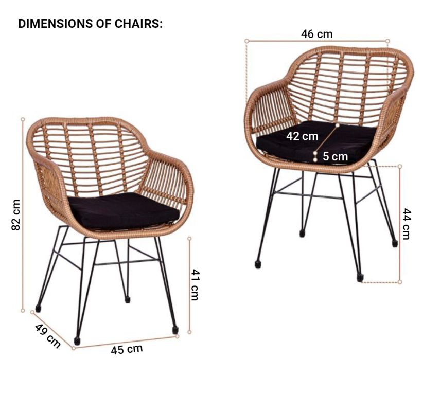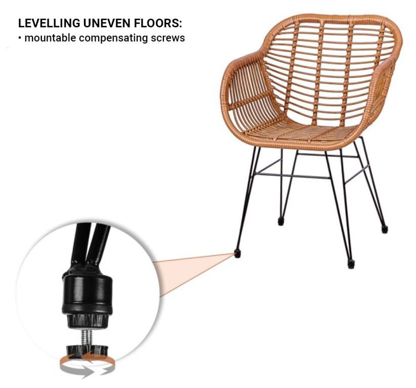 Nasz zestaw krzeseł rattanowych wykonany jest z ręcznie tkanego polirattanu z malowaną proszkowo stalową ramą, dzięki czemu nadaje się do użytku wewnątrz i na zewnątrz. Ergonomicznie ukształtowane krzesła z poduszkami o grubości 5 cm zapewniają wysoki komfort siedzenia. Dzięki zamontowanym śrubom poziomującym na nogach krzeseł, można bardzo łatwo wypoziomować. Solidna rama mebli ogrodowych wykonana jest z ocynkowanego i malowanego proszkowo metalu, a łatwa w pielęgnacji wiklina wykonana jest z wysokiej jakości polirattanu.