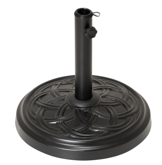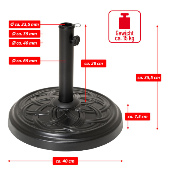 Ta solidna, 15-kilogramowa, okrągła podstawa parasola wykonana z betonu nie tylko spełnia swoją funkcję jako bezpieczna podpora parasola, ale także dobrze wygląda i jest lekka i praktyczna w użyciu. Stojak jest powlekany na czarno i ma dekoracyjny wzór. Wyposażony w śrubę blokującą, która mocuje parasol. Idealny na taras lub balkon. Okrągły talerz ma średnicę około 40 cm. Całkowita wysokość wynosi około 35,5 cm. Dzięki wadze 15 kg stojak nadaje się do parasoli do 2 m - nie do parasoli wspornikowych. Zwróć również uwagę na inne nasze artykuły ogrodowe, takie jak parasole, stoły, krzesła składane, krzesła piętrowe, leżaki, ławki wykonane z metalu, plastiku lub drewna.