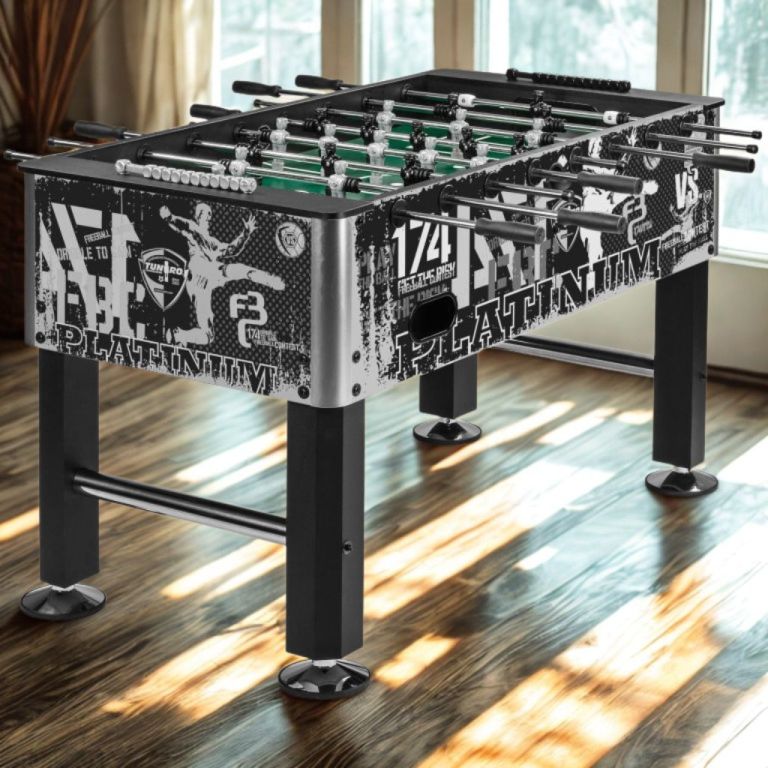 Stół do piłkarzyków TUNIRO BASIC ma wagę 75 kg i gumowane nóżki z regulacją wysokości.. Uchwyty są doskonale ergonomiczne, pozostają antypoślizgowe nawet dla pocącej się dłoni. Pręty do gry marki LONHART są bezpieczne i zapobiegają przypadkowemu zaciśnię-cia palców pomiędzy rączką a krawędzią stołu. W celu wyeliminowania wgniecenia boiska zbudowanego na twardym podłożu o grubości 24 mm - dodatkowo wzmocniono pole gry żelazną kratownicą od spodu. Okrągłe metalowe nogi są wydrążone w środku, mimo nie-wielkiej powierzchni nośnej posiadają bardzo dobrą stabilność.