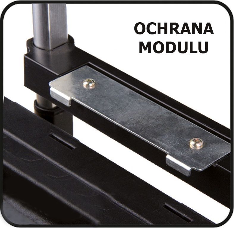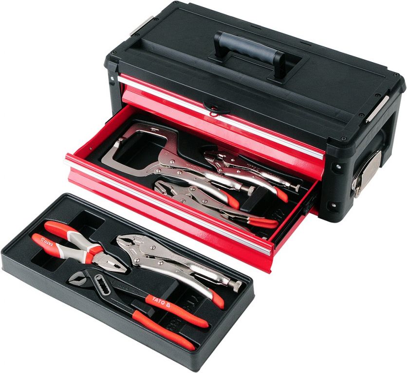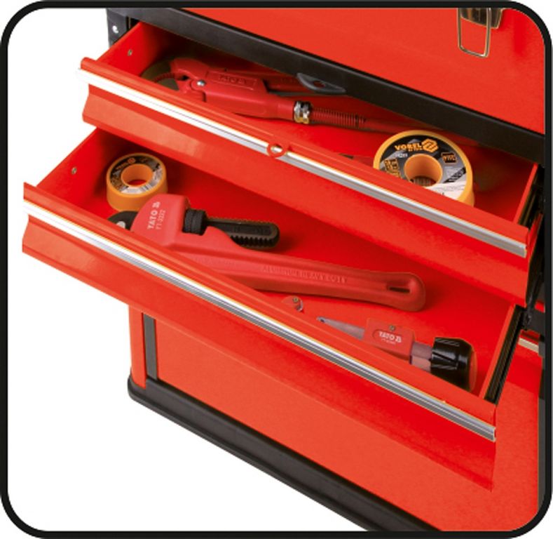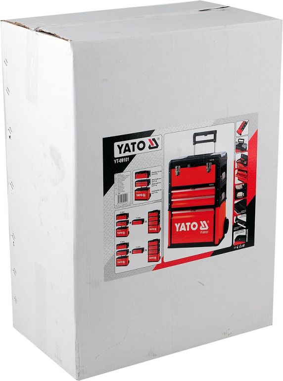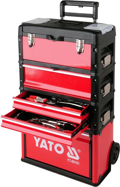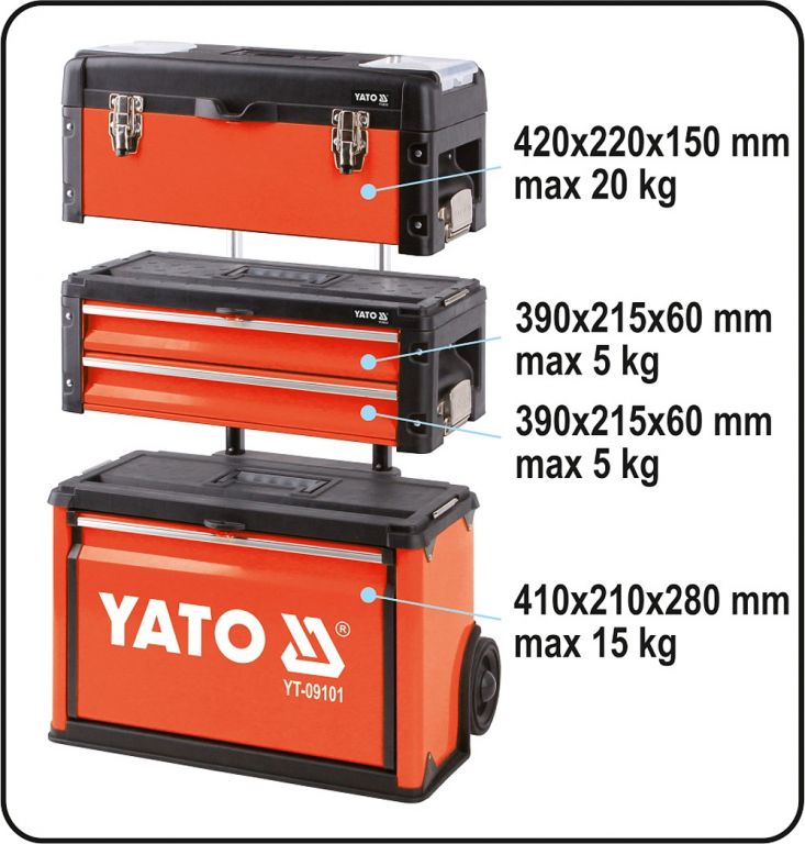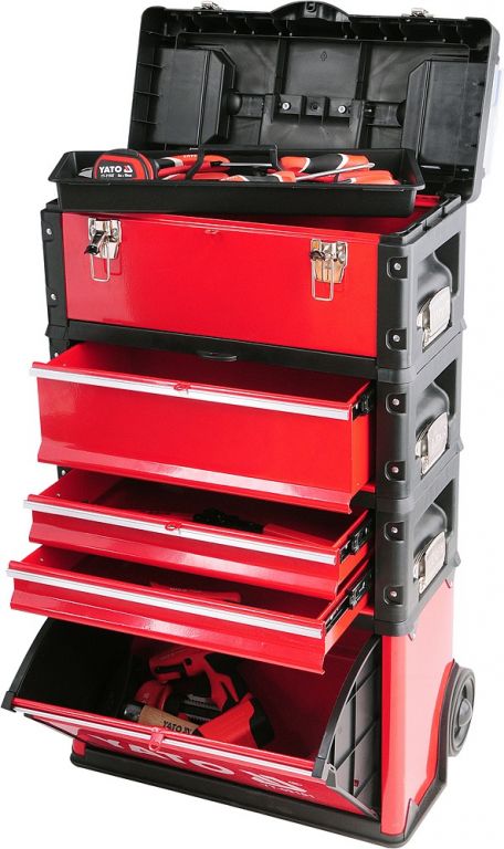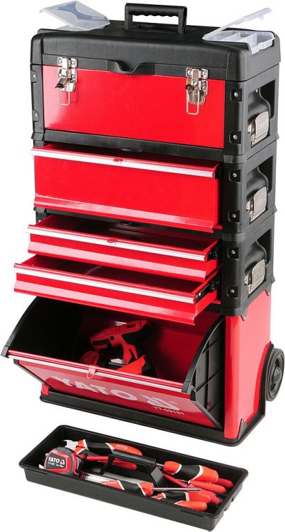 Trzyczęściowa szafka serwisowa z wbudowanymi kółkami i teleskopowym uchwytem do łatwego przenoszenia przechowywanych narzędzi. Górny moduł można zamknąć za pomocą dwóch metalowych klipsów, które można zablokować za pomocą zamka (brak w zestawie). Ponadto jest wyposażony w dwie plastikowe skrzynki na małe części. Moduł centralny ma dwa metalowe gniazda. Moduł dolny jest bardzo nieporęczny i ma wysoką ładowność.