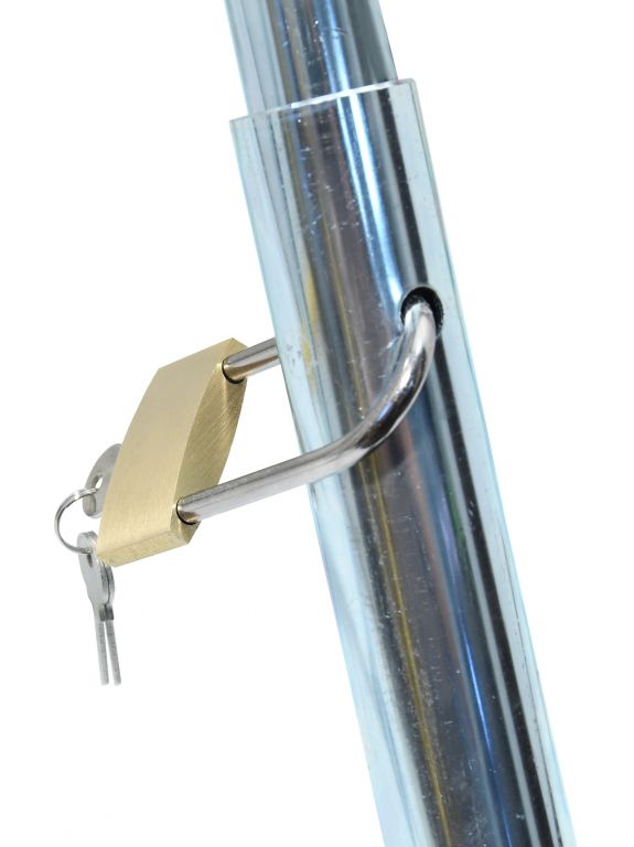 Bariera składa się z solidnej konstrukcji z obróbką powierzchni odpowiednią do zastosowań zewnętrznych. Zaryglowanie rozwiązuje kłódka umieszczona na pochyłej, teleskopowej części konstrukcji, dzięki czemu po odblokowaniu można łatwo i szybko złożyć szlaban.