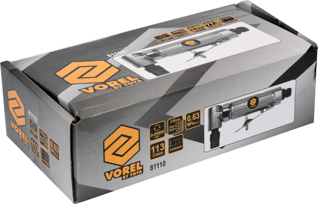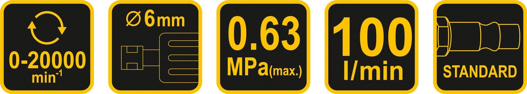Ta pneumatyczna szlifierka jest narzędziem napędzanym strumieniem powietrza sprężonego pod odpowiednim ciśnieniem. Tarcze tnące i szlifierskie mogą ciąć i szlifować różne materiały. Szlifierka jest wyposażona w szybkozłącze, które można podłączyć do układu pneumatycznego.