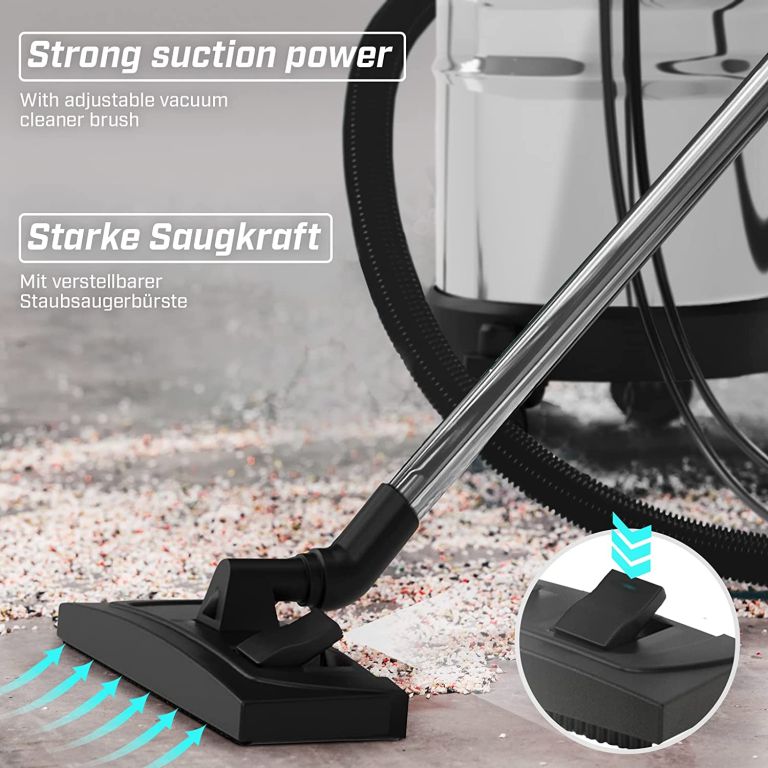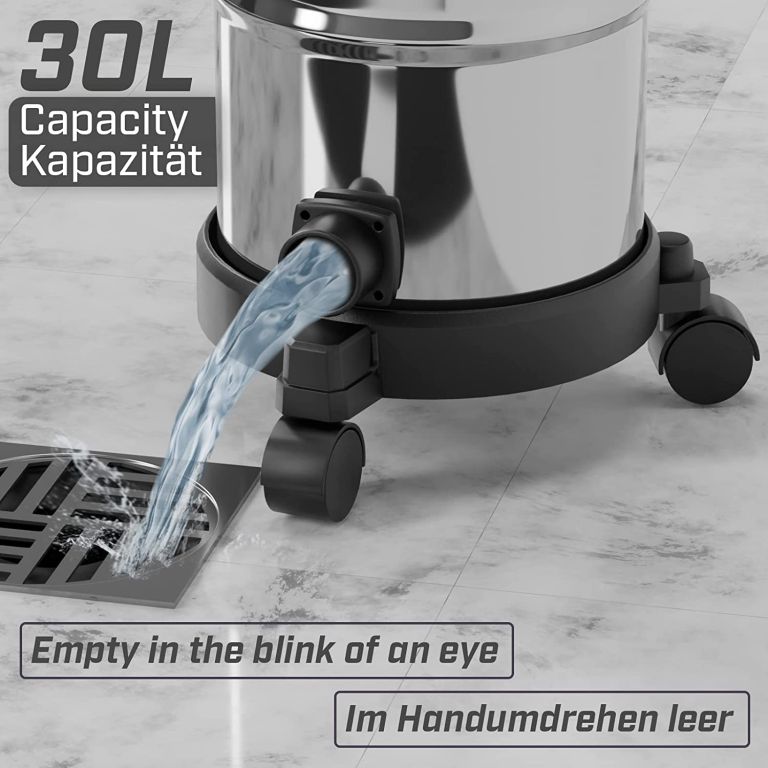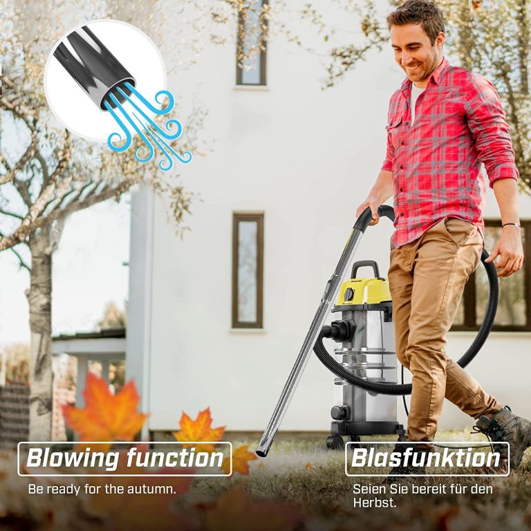 Odkurzacz przemysłowy nadaje się do drobnych i grubych zabrudzeń. Oznacza to, że możesz go używać między innymi do zbierania kurzu, brudu, cząstek drewna, okruchów i włókien. Dzięki ssawce szczelinowej, długiemu wężowi i kablowi odkurzacza bez problemu dotrzesz do wszystkich miejsc w pomieszczeniu. Nasz odkurzacz do pracy na mokro i na sucho wyposażony jest w 3 filtry: filtr papierowy, filtr piankowy oraz filtr nabojowy. Kiedy masz już dość zbierania liści, po prostu chwyć ten wielofunkcyjny odkurzacz, przełącz go w tryb nadmuchu, a praca zostanie wykonana w mgnieniu oka. Odkurzacz wielofunkcyjny ma na dole odpływ wody, dzięki czemu opróżnianie jest bardzo łatwe. Ponadto jest bardzo mobilny dzięki kołom 360°.