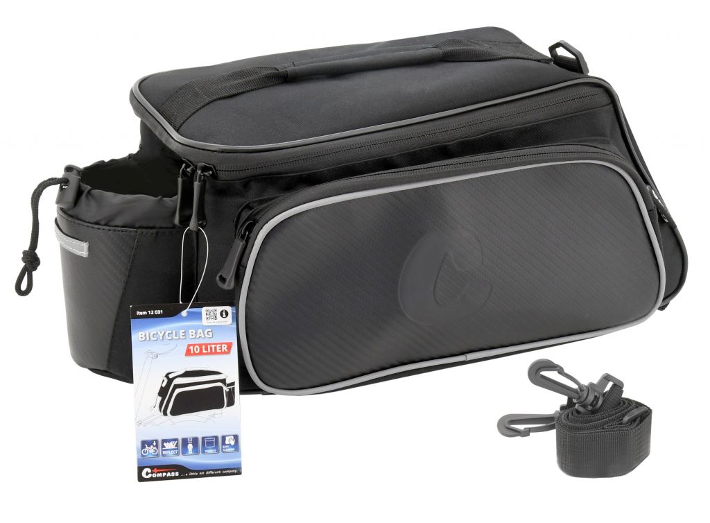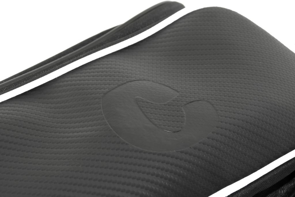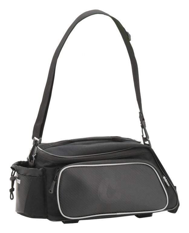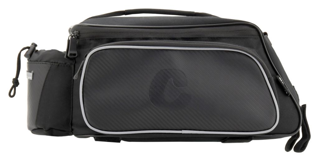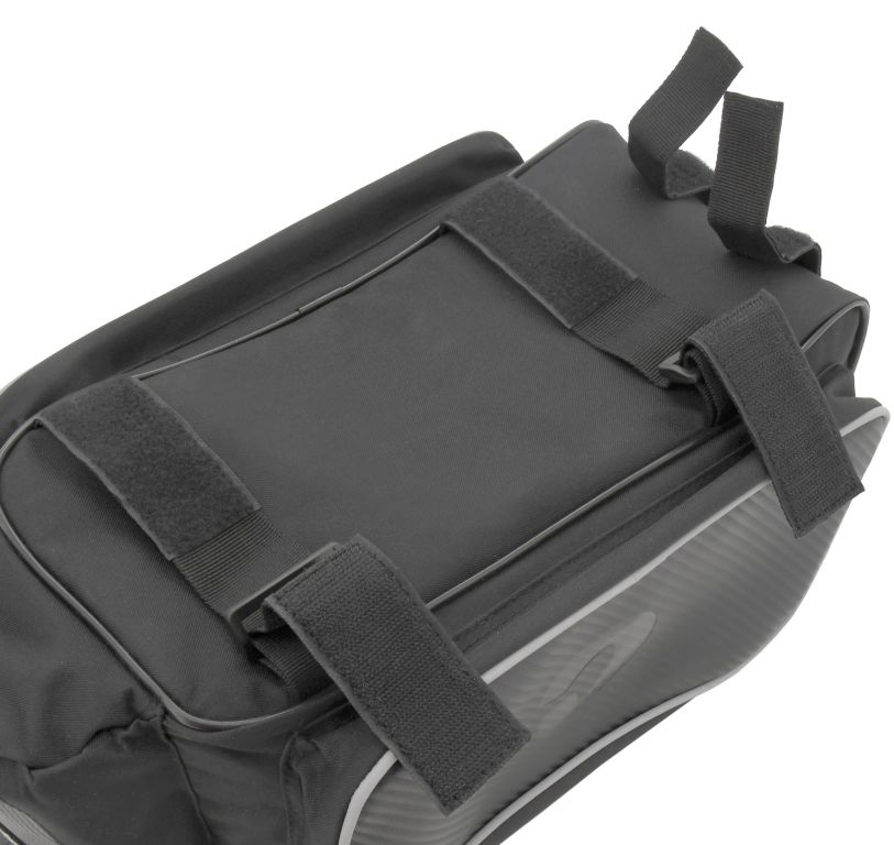 Torba wyposażona jest w główną kieszeń 8L oraz dwie boczne kieszenie 1L. Wszystkie kieszenie wyposażone są w zamek błyskawiczny. Tył torebki uzupełnia etui na mniejszą butelkę lub napój w puszce. Na dole znajdują się regulowane klamry ułatwiające zapięcie do różnych wymiarów nosideł. Dodatkowo torbę można nosić po odczepieniu od nosidła, dzięki odpinanemu paskowi na górnej stronie. Materiał uzupełniają elementy odblaskowe, które zapewniają Ci bezpieczeństwo, przy zmniejszonej widoczności. Wszelkie zabrudzenia można łatwo usunąć, dzięki zastosowaniu materiału, który łatwo się myje i wygląda jak włókno węglowe.