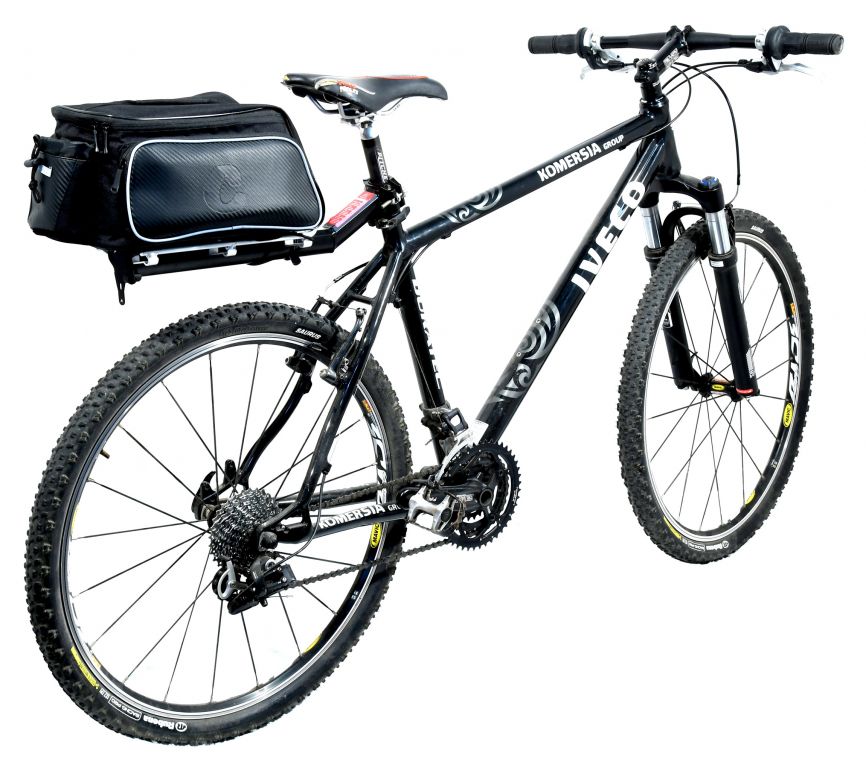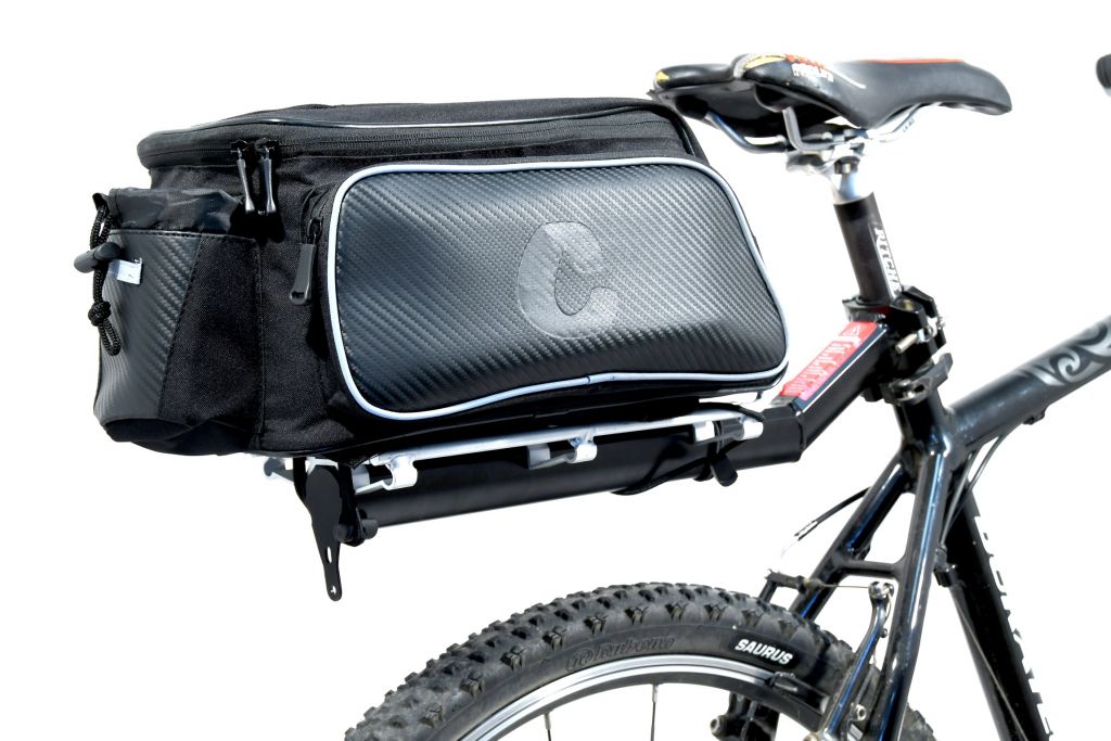 Praktyczna torba rowerowa na tylny bagażnik z kilkoma kieszeniami, na bagażnik rowerowy. Dzięki pętli, którą można przyczepić do torby, jej przenoszen