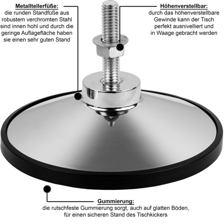 Marka TUNIRO jest znana od swojego powstania w 2005 roku z profesjonalnych domowych piłek nożnych i maksymalnej radości z gry, a także z doskonałego stosunku ceny do jakości. Podczas opracowywania wszystkich komponentów zwraca się uwagę na zgodność ze standardami turniejowymi w zakresie bezpieczeństwa i grywalności. Ponadto wszystkie piłkarzyki TUNIRO posiadają odpowiedni certyfikat BTFV (Bayerischer Tischfußballverband). Piłkarzyki TUNIRO BASIC jest wyposażona w nóżki (pogumowane) o regulowanej wysokości. Uchwyty są idealnie ergonomiczne, a uchwyty są antypoślizgowe nawet dla spoconej dłoni. Kije do gry są bezpieczne i nie dochodzi do przypadkowego przytrzaśnięcia palca między rączką a krawędzią piłki. Aby zapobiec wgnieceniom pola gry, pola gry o grubości już 24 mm zostały dodatkowo wzmocnione od spodu żelaznym krzyżem. Nogi z okrągłej blachy są puste w środku, dzięki małej powierzchni podparcia mają bardzo dobrą stabilność.